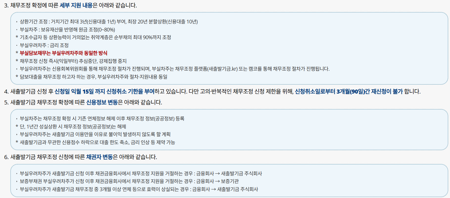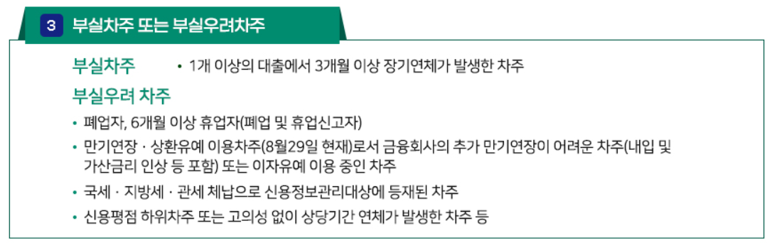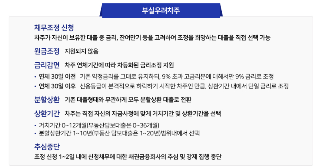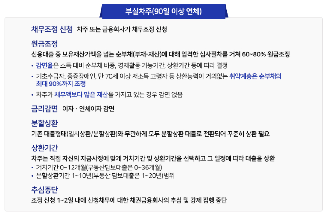 - 90일 이상 장기연체자(부실차주): 원금 일부 탕감, 이자·연체료 감면, 상환기간 연장