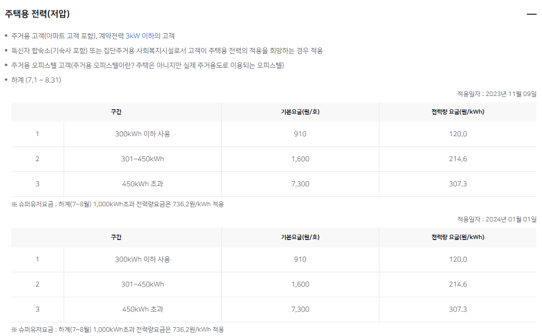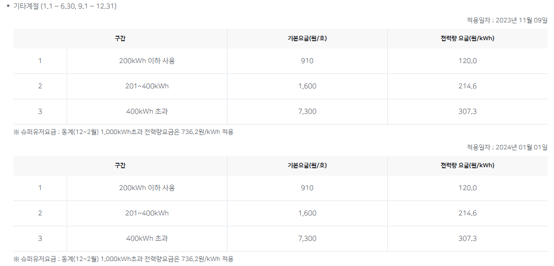 | 단계 | 사용량 구간 | 기본요금 | kWh당 요금 |
