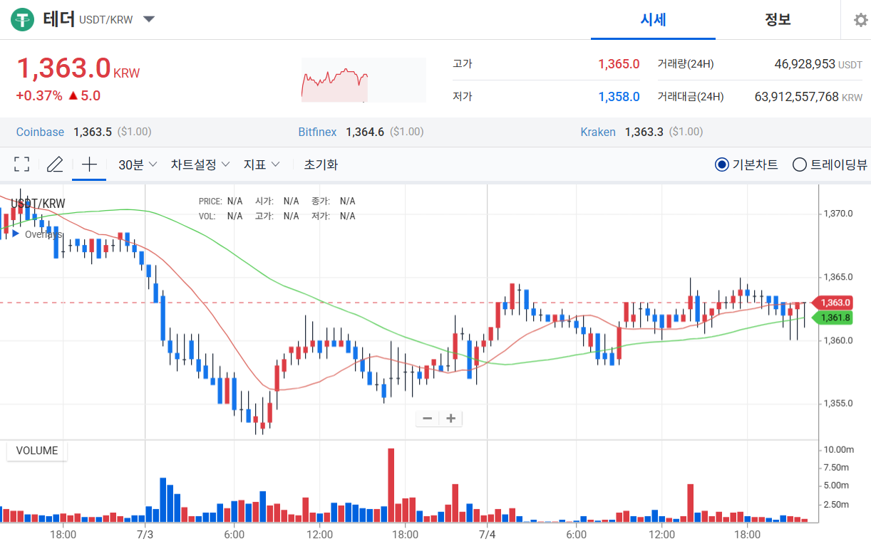 테더는 1달러 연동을 목표로 하지만, 시장 상황에 따라 0.995 ~ 1.01 USD 사이에서 미세한 가격 변동이 있습니다.