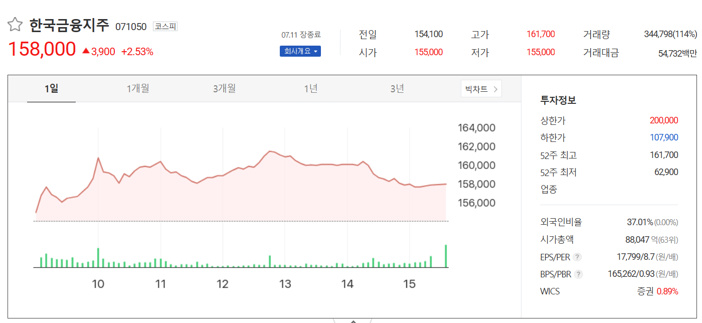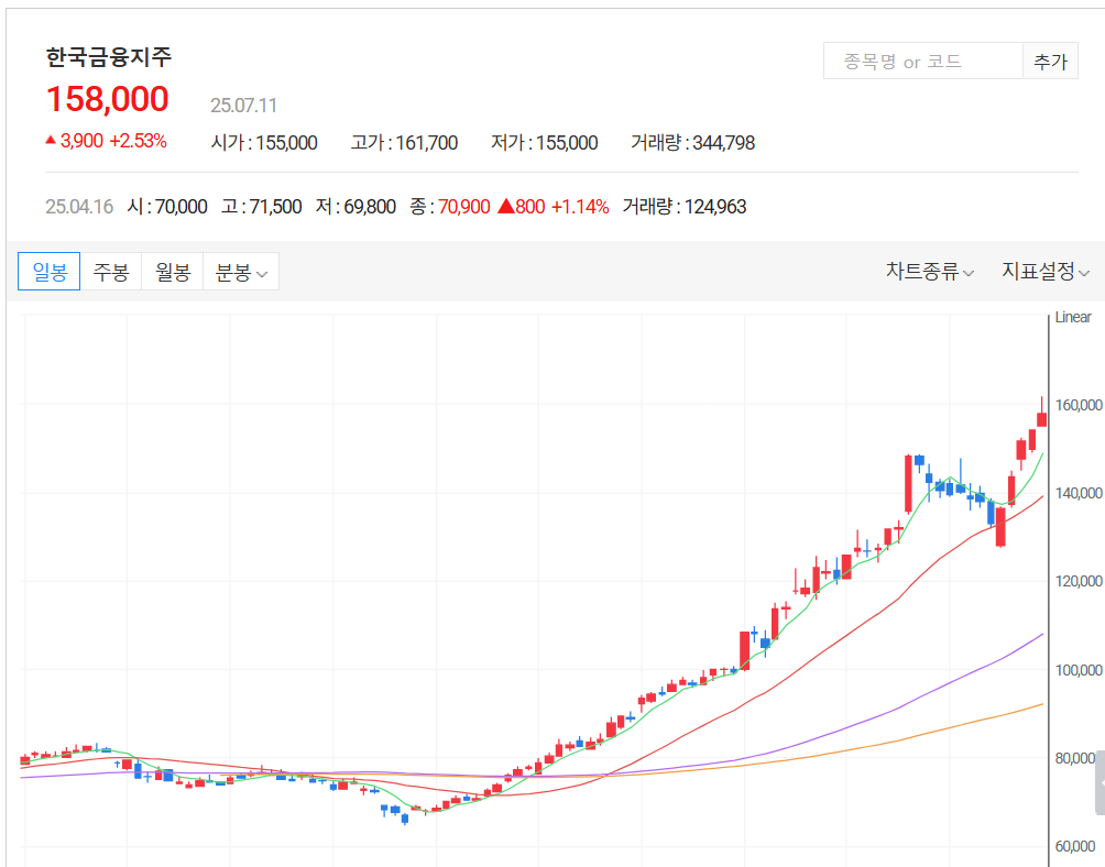 금융주 강세가 이어지는 가운데 한국금융지주(071050)의 주가가 고점을 향해 치솟고 있습니다. 2025년 7월 11일 종가 기준 158,000원을 기록하며 52주 최고가(161,700원)에 근접하고 있는데요.